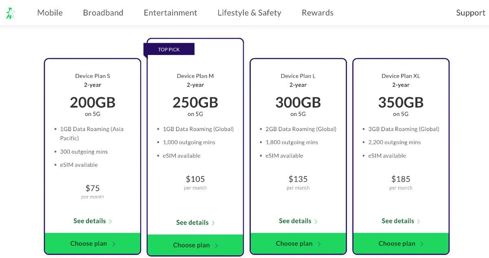S Plan (S$75 monthly) | M Plan (S$105 monthly) | L Plan (S$135 monthly) | XL Plan (S$185 monthly) | |