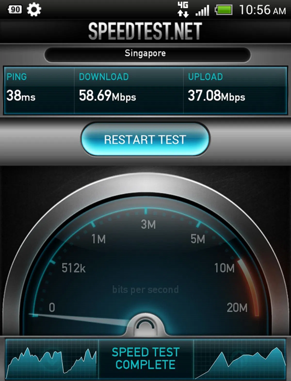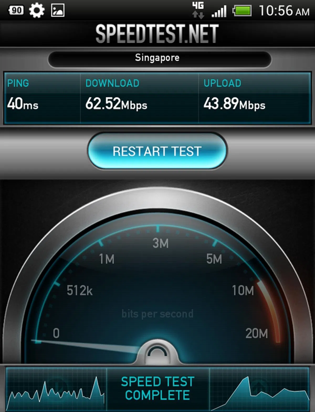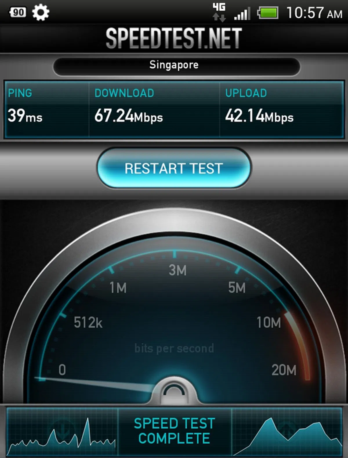 - Pinging a local server (Singapore, NewMedia Express) via the Speedtest.net app to check its download and upload speeds
