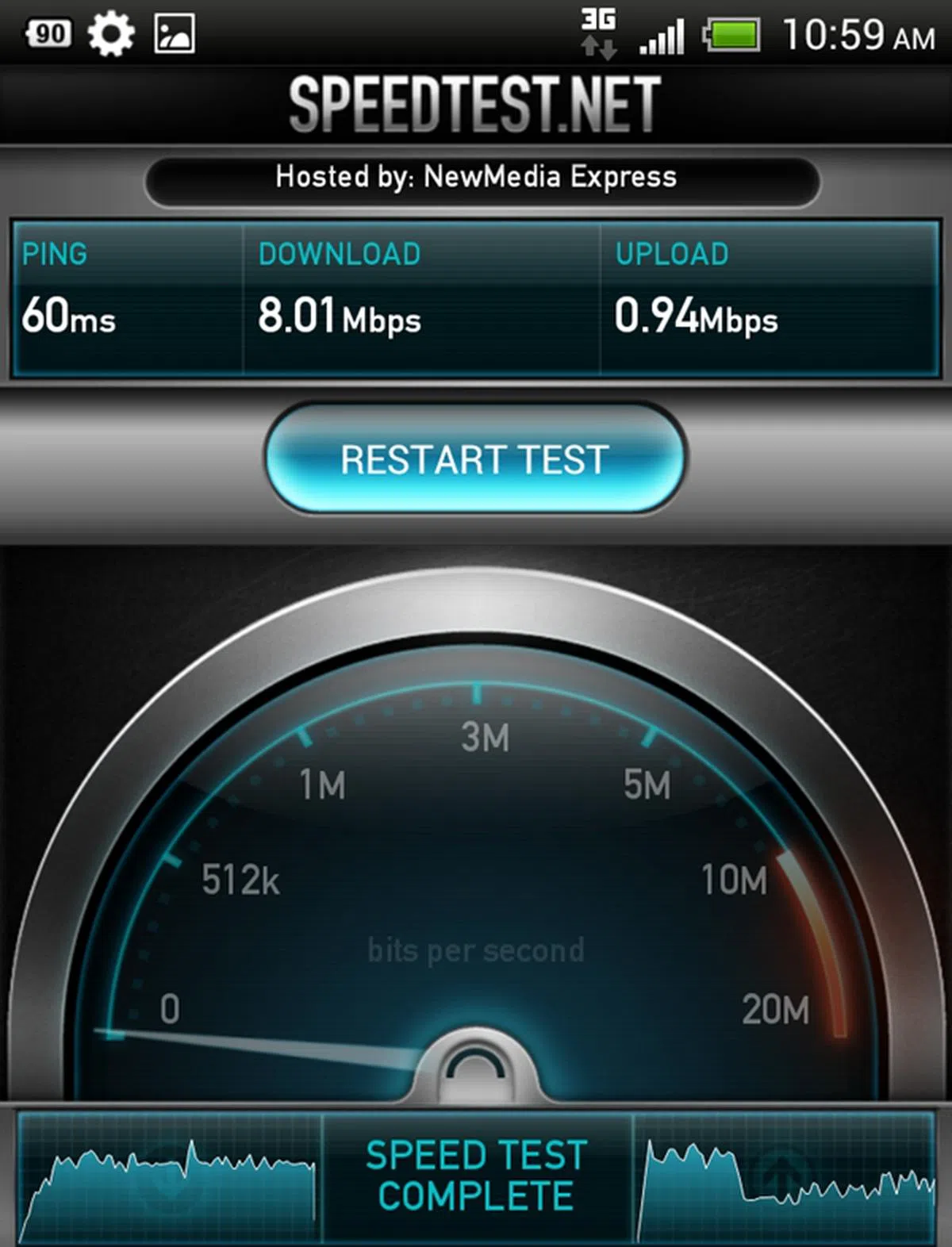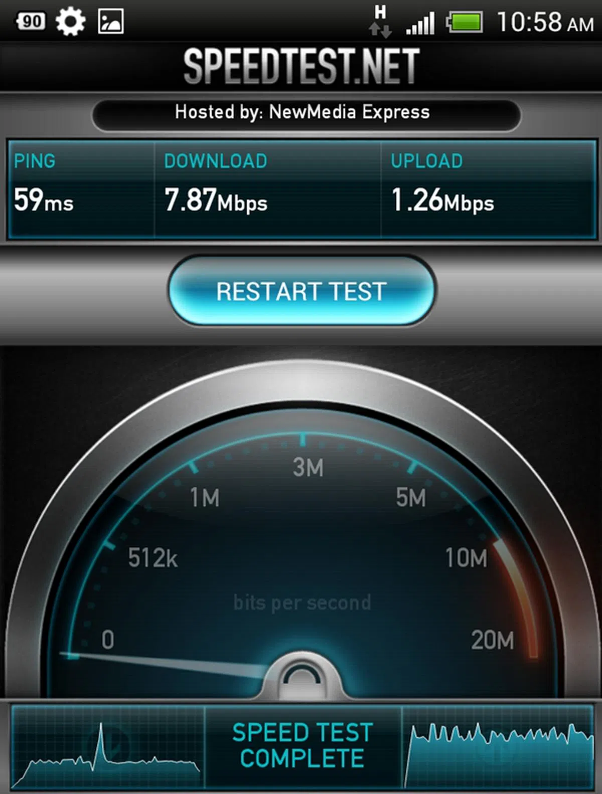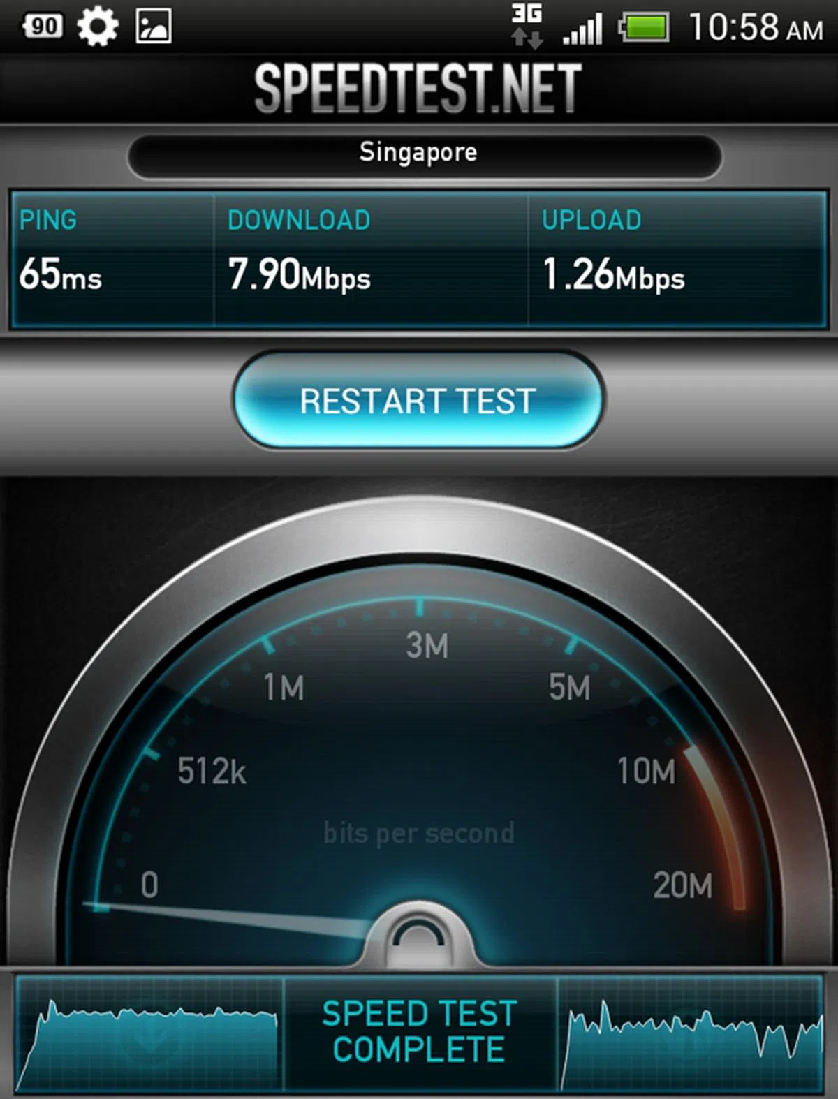 - Pinging a local server (Singapore, NewMedia Express) via the Speedtest.net app to check its download and upload speeds