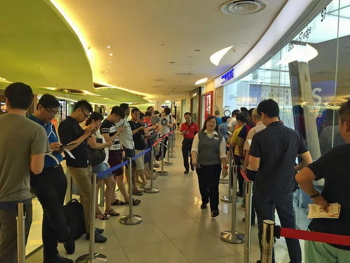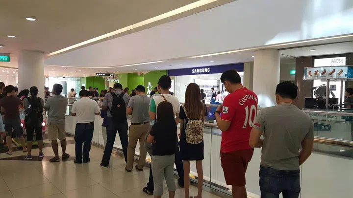 Over at the StarHub outlet in Tampines Mall, there were approximately 80 people in the queue for the latest Samsung flagship phones.