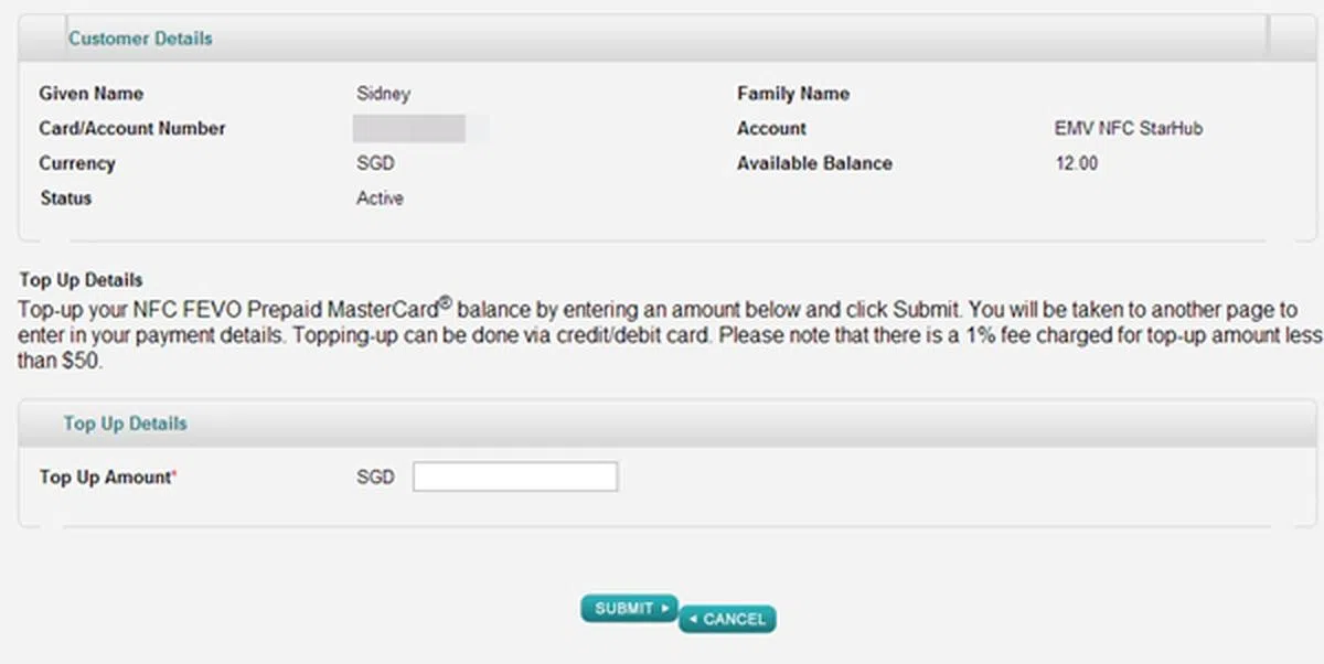 You can top up the NFC FEVO Prepaid MasterCard at AXS machines or online. Do take note that the minimum top up value per transaction is $5 on AXS machines, and $1 online. The maximum value the NFC FEVO Prepaid MasterCard can hold at any time is $100.