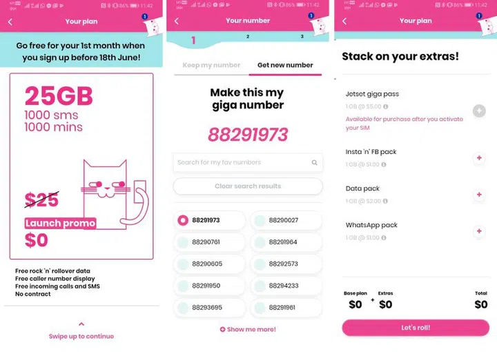 Giga offers only a single plan: $25 for 25GB of data. What makes it compelling is that Giga is also offering 1,000 free SMS, 1,000 minutes of free talk time, free caller ID, free incoming calls AND 2-month rollover data! This means if you don't finish your data for any billing month, it can be carried forward at maximum for the next two months. And as an icing on the cake, no contracts. As a launch promotion, all new signups before 18th June will get 1 month free subscription.