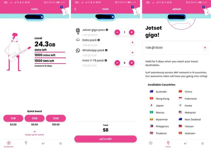Additional data can be purchased on the fly in 1GB increments for $2 per 1GB. If you're a heavy Facebook/Instagram or Whatsapp user, you can purchase specific data packs tied to those apps at just $1 per 1GB. They also have an interesting Roaming option called Jetset giga! where you can buy 1GB of data for $5 that can be used in any of the 14 countries listed below on any network. It's not a very expansive list sure, but it can be quite useful if you travel within Asia alot.