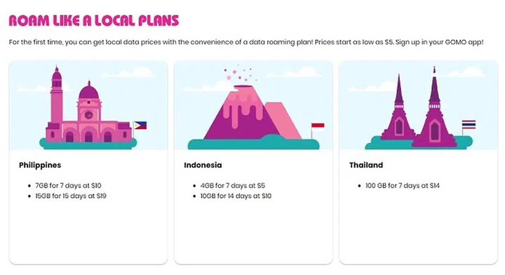 Now, GOMO subscribers have a new roaming plan called Roam Like A Local that gives them more data at local rates. Currently, the service is available in three countries - the Philippines, Indonesia, and Thailand. The rates and data amount vary for each country, but this screenshot makes it all clear:-
