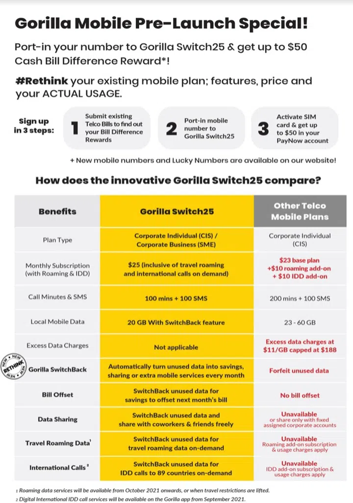 Both individuals and businesses are entitled to a S$50 Cash Bill Difference Reward as a pre-launch promotion. Users can submit their existing telco bills to see bill differences, and port in their existing numbers to a Gorilla Switch25 plan. Activating the issued Gorilla Mobile SIM card nets a maximum of S$50 in the user’s PayNow account (amount received depends on bill difference from Gorilla’s S$25 plan).