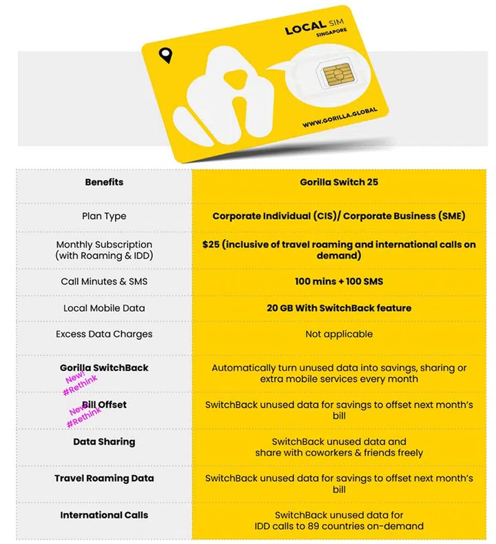 Gorilla Mobile’s Switch25 plan is a SIM-only, no-contract plan that costs S$25 per month per user. It is available to all Singapore registered companies, Singaporeans, Permanent Residents, EPass, EntrePass and SPass holders aged 21 and above. Sign-ups are available via its website here.