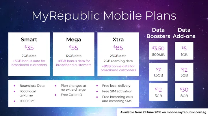 Customers who are also subscribers to MyRepublic's fiber broadband services will receive an additional 3GB data on the S$35 plan, or an additional 8GB data on the S$55 and S$85 plans.