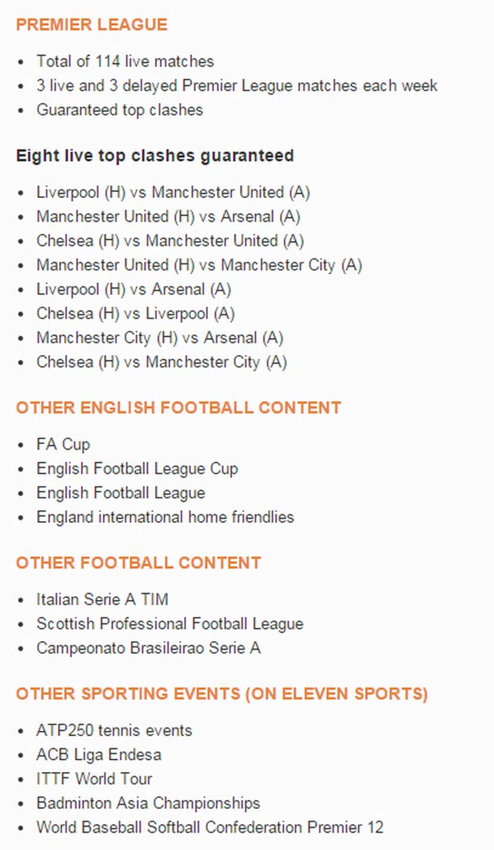 The coverage by Eleven Sports Network spans three "channels" - Eleven, Eleven Plus, and Eleven Sports. Eleven offers live football coverage from leagues such as FA Cup, English Football League Cup and more. Eleven Plus is dedicated to the Premier League, and it offers three live matches (one game on Saturday and two on Sundays) and three delayed matches weekly, on top of ancillary programming. Eleven Sports showcases other sporting events, including baseball, badminton and table tennis. We’ve attached the promised coverage below (found on M1’s website):
