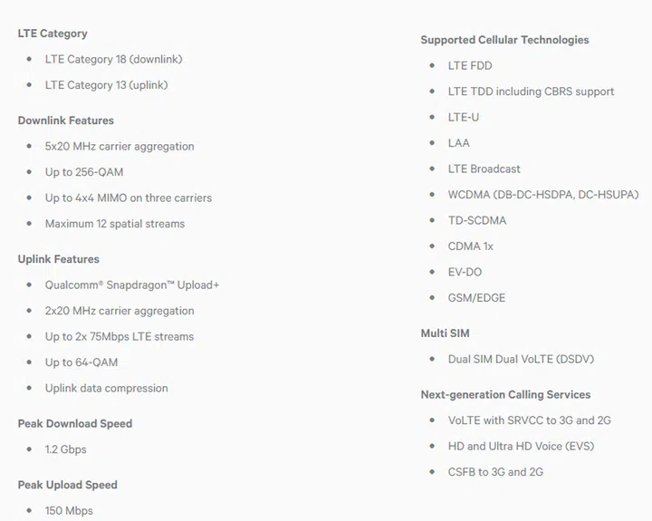 Qualcomm said that the X20 LTE modem will only surface in the market during the first-half of 2018. It also utilizes License Assisted Access (LAA) technology, enabling the modem to make use of unlicensed spectrum bands in the same fashion as its X16 counterpart. That said, the Snapdragon X20 is manufactured using the 10nm FinFET process, which is a step above X16’s 14nm FinFET process. You can learn more about the X20's technical specifications from the screenshot below: