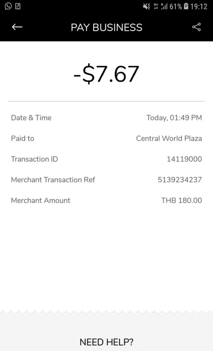 To prove this point, here's a snapshot of a payment made earlier in the day using Singtel Dash in Bangkok:-