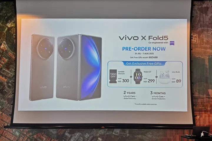 During the pre-order period, each purchase of Vivo X Fold5 via Vivo’s official platforms is also entitled to a S$300 discount, a free Vivo Watch GT (worth S$299), a free pair of Vivo Buds (worth S$89), two years of global warranty, and three months of screen warranty.