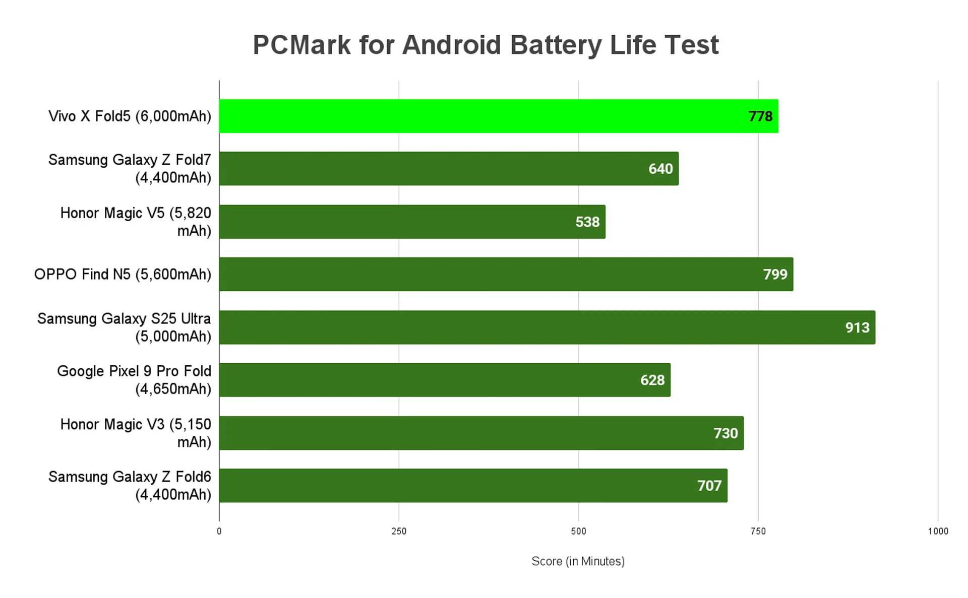 Surprisingly, Vivo has opted to use the older Qualcomm Snapdragon 8 Gen 3 processor in the X Fold5 instead of the 2025 chip for flagship-tier Android handsets, Snapdragon 8 Elite. This will almost certainly result in relatively lower benchmark scores since all of the 2025 launches we have here (like the Honor Magic V5, Samsung Galaxy Z Fold7 and OPPO Find N5) use the up-to-date processor.
