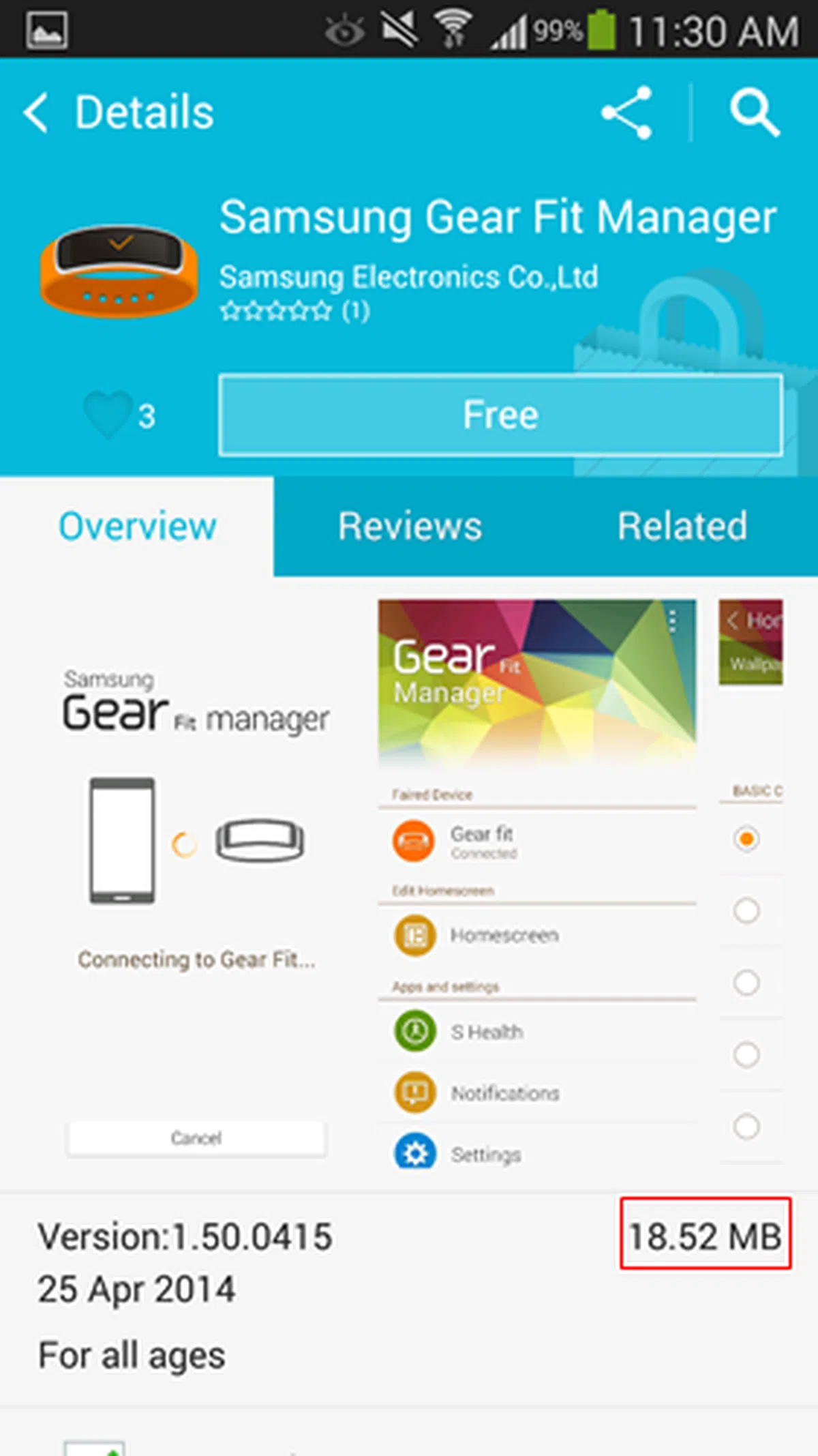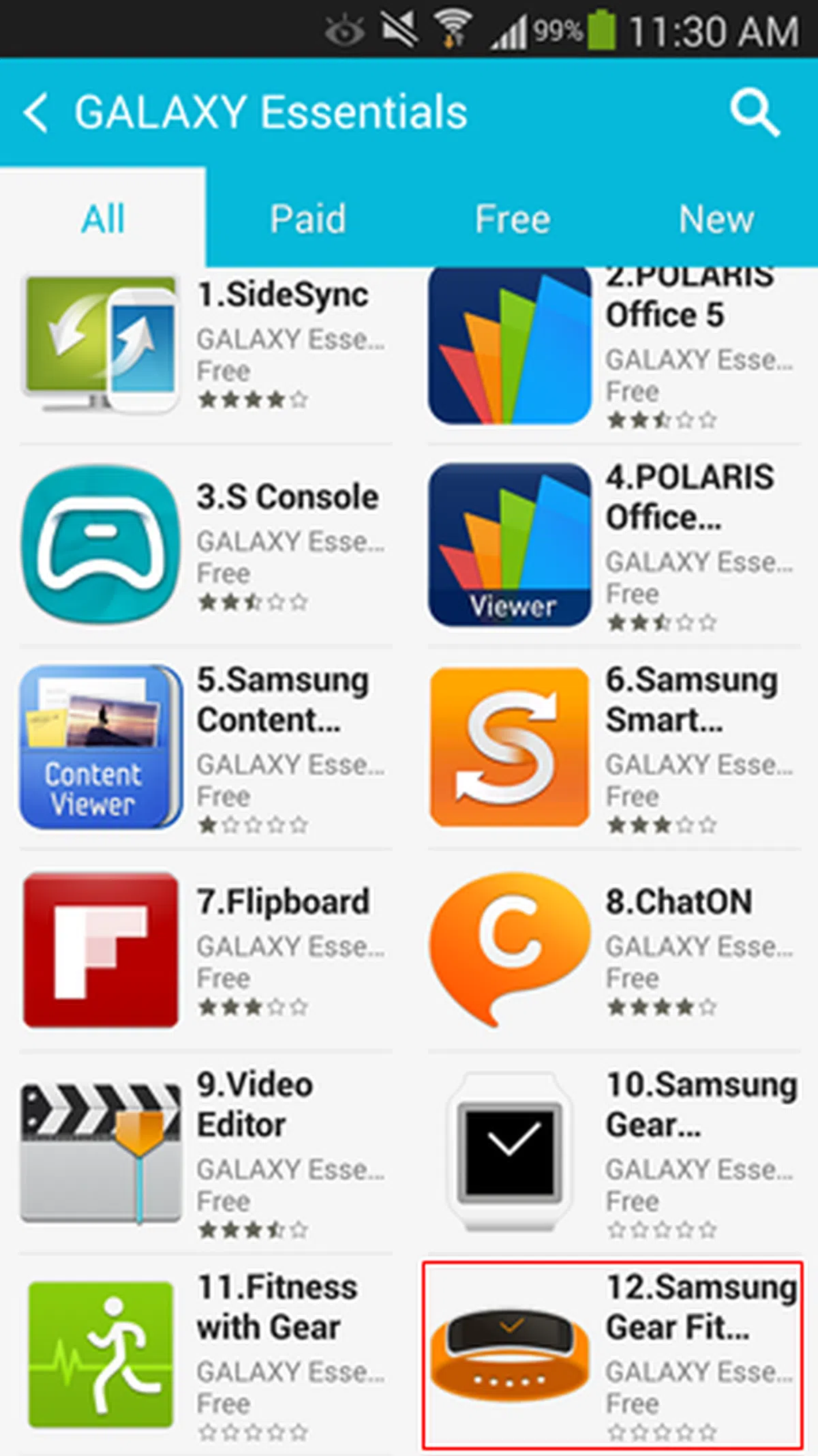 To connect and sync the Gear Fit with any of the 18 devices above, you need to download the Gear Fit Manager app from Samsung Apps (note: not Google Play Store; and not the same Gear Manager app used by the other Gear devices). The Gear Fit Manager can be downloaded by doing a search in Samsung Apps or you can select Category > Galaxy Essentials. As with all wearable devices, the Gear Fit connects via Bluetooth.