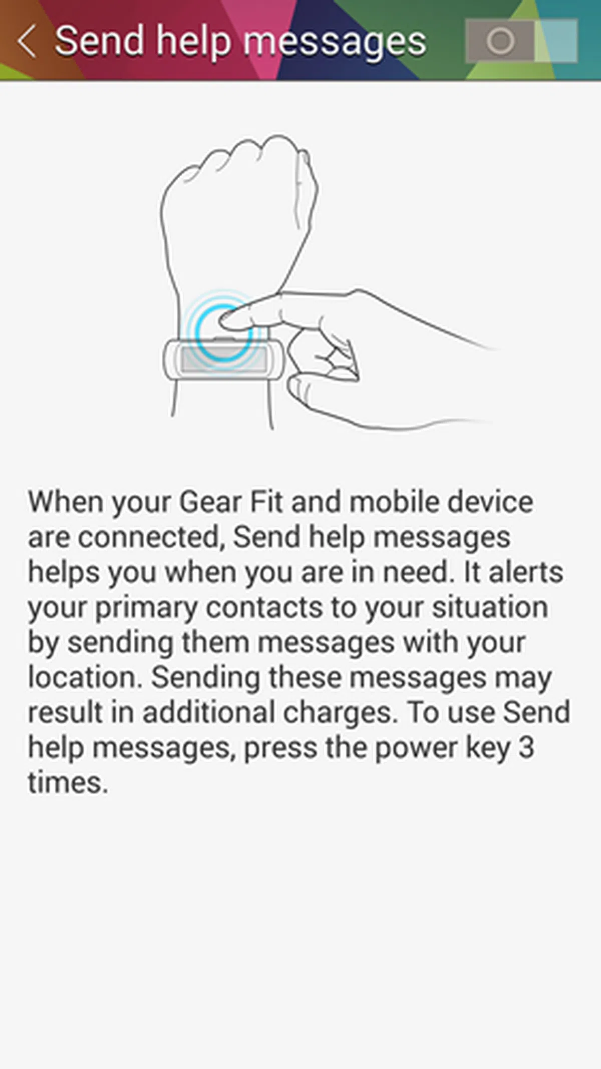 Samsung has baked a safety feature onto the Gear Fit; pressing the power key three times will send help messages to your primary contacts. You are allowed to add up to four emergency contacts. According to Samsung, the Gear Fit will send two messages to the emergency contacts once the safety feature is activated. The first will contain a link to your location on a map and an emergency text message. A second message that contains a reworded text message and a link to your location on a map will be sent after a short time.