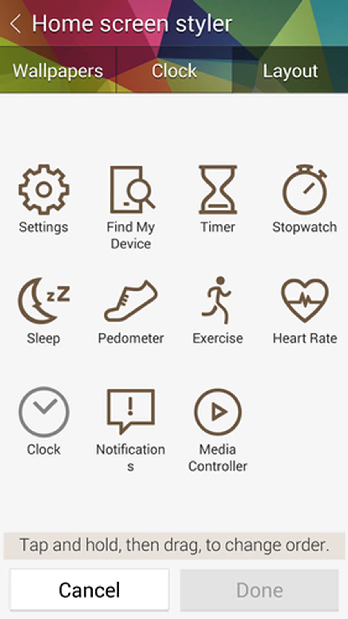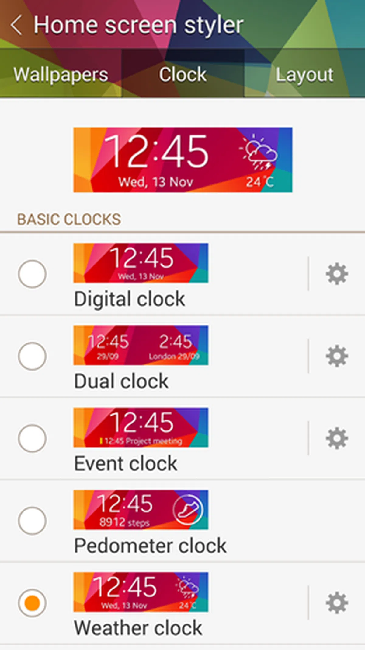 The Home Screen Styler lets you personalize the interface of the Gear Fit from its color, wallpaper, clock style to the order of icons. For example, you can select the weather clock face where you can see the weather information such as the temperature and forecast right on the screen of the Gear Fit.