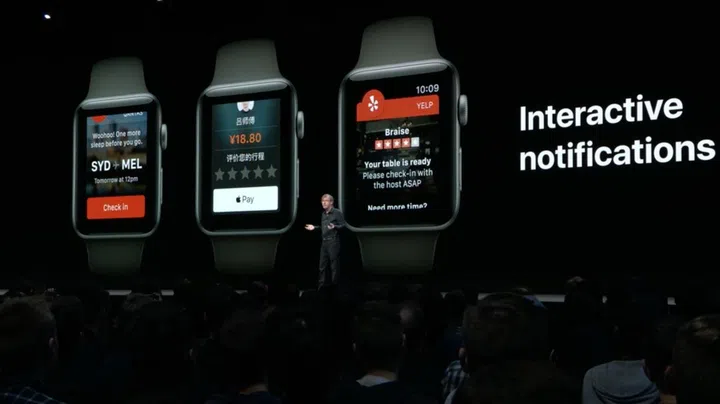 Like on iOS 12, multiple notifications from the same app will now be grouped together. Apple also demoed richer notifications on watchOS 5, like a button to pay for a ride using Apple Pay. It’s all done for the purpose of getting things done without having to open up the app. For example, a reservation app might show the option to change the time right from the notification itself.