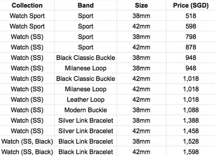 Here are the key prices for the aluminum Watch Sport and the (regular) stainless steel Watch. For more details on all the models offered, check out Apple's website.