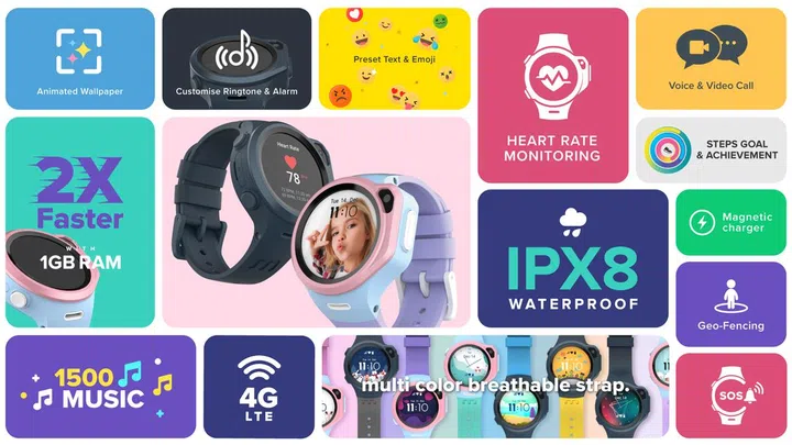 This smartwatch for kids has 4G connectivity for calls and video calls, along with classic smartwatch features like heart rate monitoring and GPS tracking.