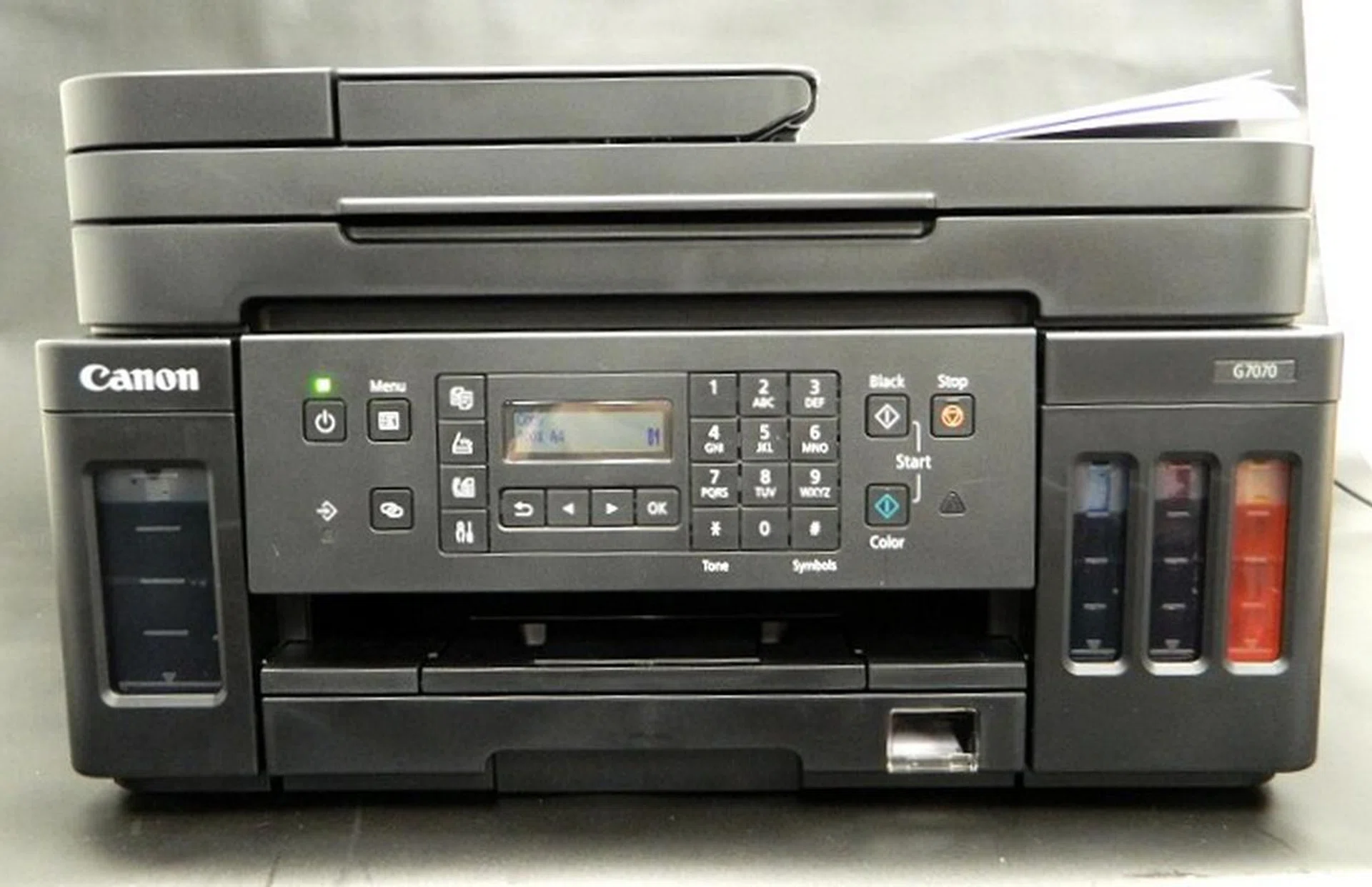 The Canon Pixma G7070 is an all-in-one printer with print, scan, copy, and fax functions.