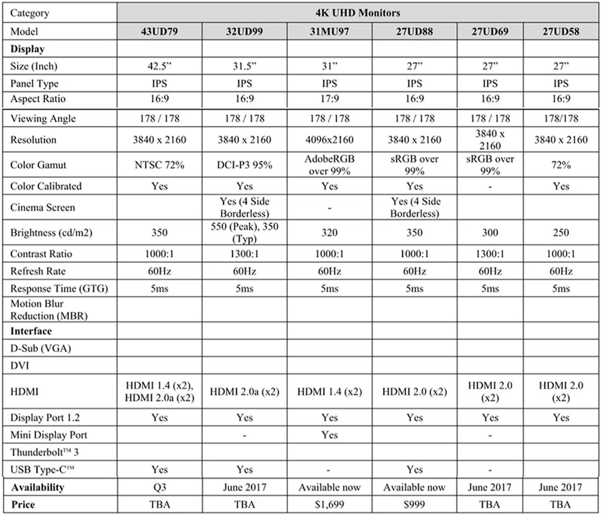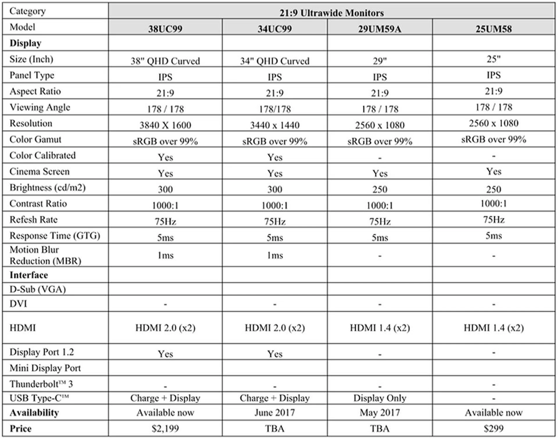 The most interesting product of the range is probably the new HDR-ready 32UD99, which was first announced at CES 2017. This is a 31.5-inch 3,840 x 2,160-pixel IPS monitor that can display over 95 per cent of the DCI-P3 color space (25 per cent larger than sRGB), which makes it ideal for content creators and other professionals who require accurate color reproductions.