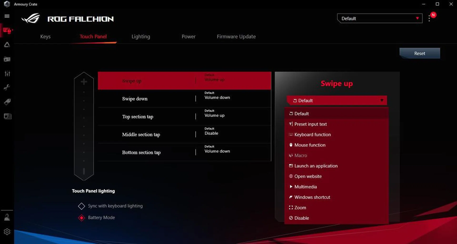 Then there's the interactive touch panel on the left edge, which is perhaps the most unique feature of this keyboard. It is programmed to adjust your volume by default, but you can change it to do anything from launching an application to zooming in on a window. Different areas of the panel also support different interactions, and you can assign specific functions to the top, middle, and bottom sections.