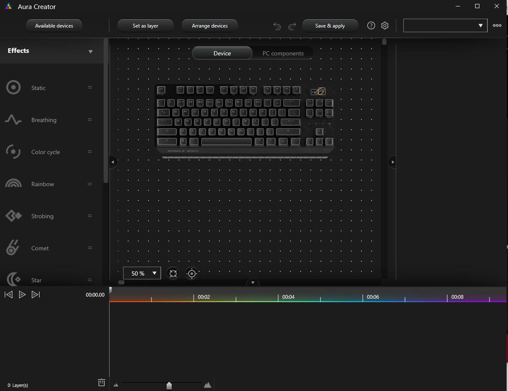 The Armoury Crate software lets you program the individual keys and lighting effects, and you can save up to five custom profiles in the onboard memory. A separate interface in Aura Creator opens even more granular customisations for greater control.