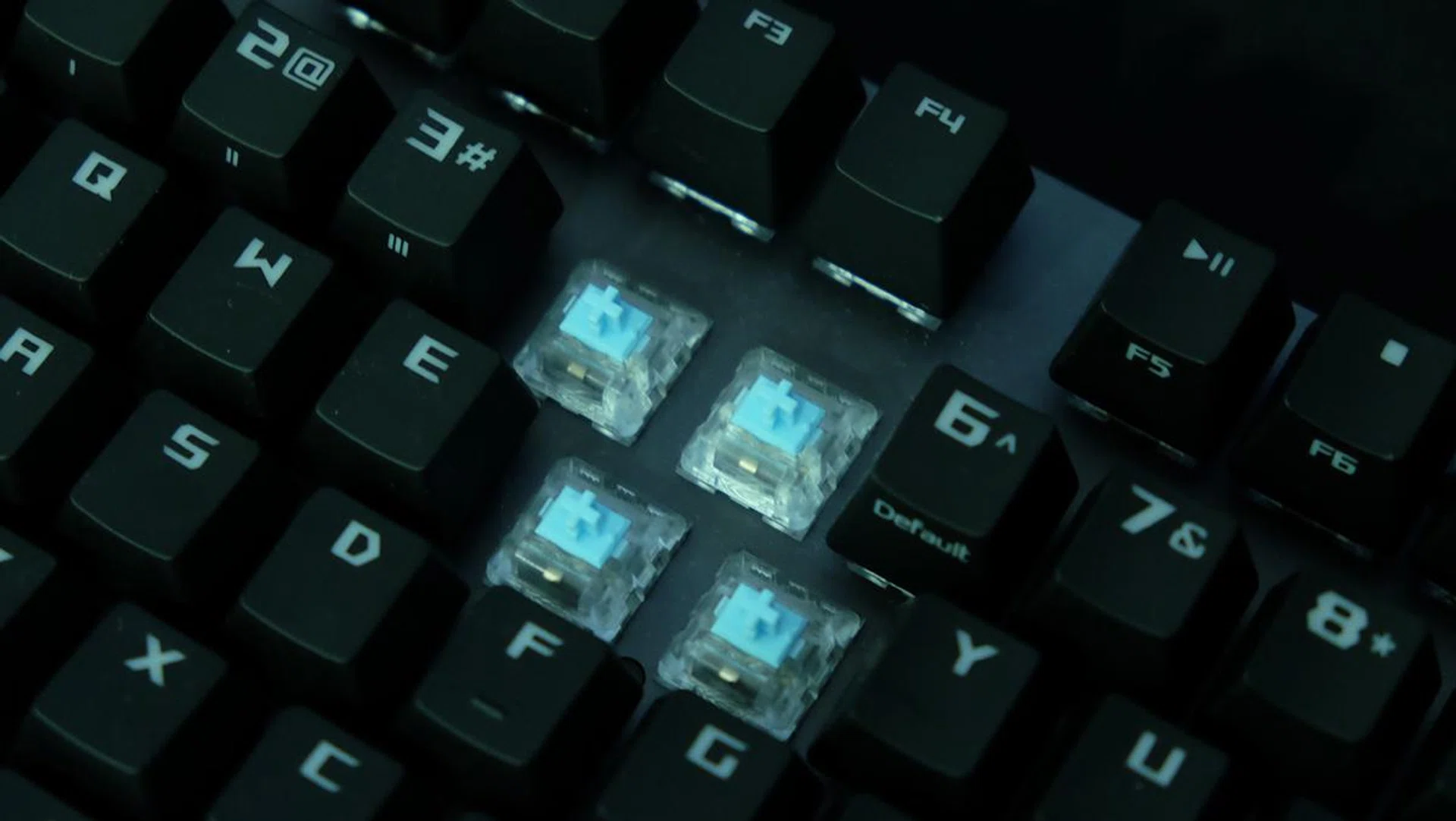 The ROG NX Blue switches are tactile, clicky switches, not unlike Cherry MX Blues. The stem is coloured a lovely baby blue, and the switch has a fairly heavy 65g actuation force. It actuates at 2.3mm, with a reset point at 2.2mm. It looks like ASUS has tried to keep the actuation and reset points as close to each other as possible to still allow for rapid switch presses. One problem with clicky switches is hysteresis, which is the difference between the actuation point and the reset point, and the NX Blues try to mitigate that somewhat.