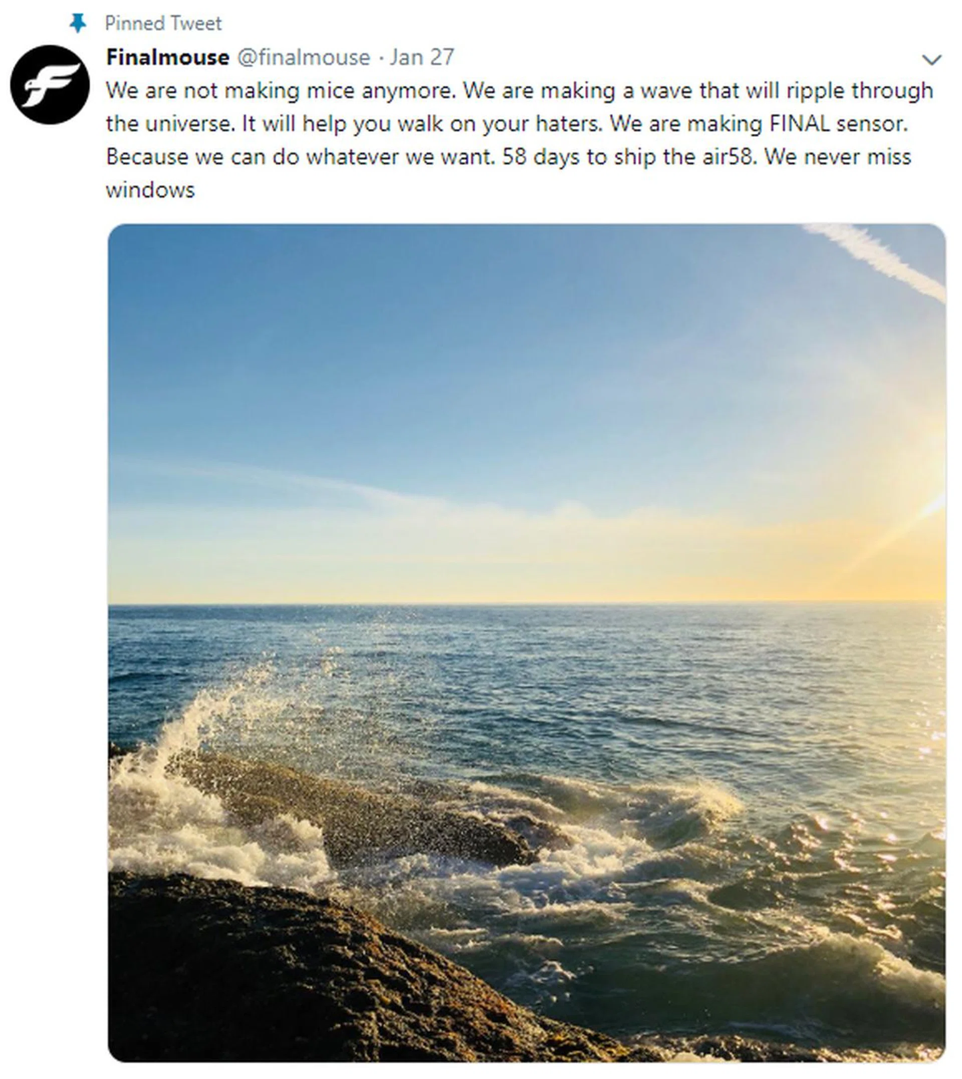 For a further look at the type of manic, hyperbolic marketing Finalmouse is fond of, here’s a screenshot of the latest pinned tweet on the company’s page:
