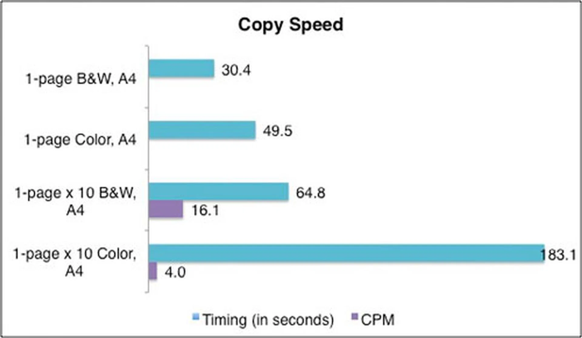 For MFPs that have an automatic document feeder (ADF), we also test how fast a 10-page document is copied. Again, timing starts upon job initiation and stops when the last page drops on the output tray. For MFPs that don't have the luxury of an ADF, we use a single-page document and duplicate it 10 times. Timing starts upon job initiation and stops when the last page drops on the output tray. For copies-per-minute (CPM) conversion, we omit the time to copy the first page. As usual, we use the printer's Normal quality setting.