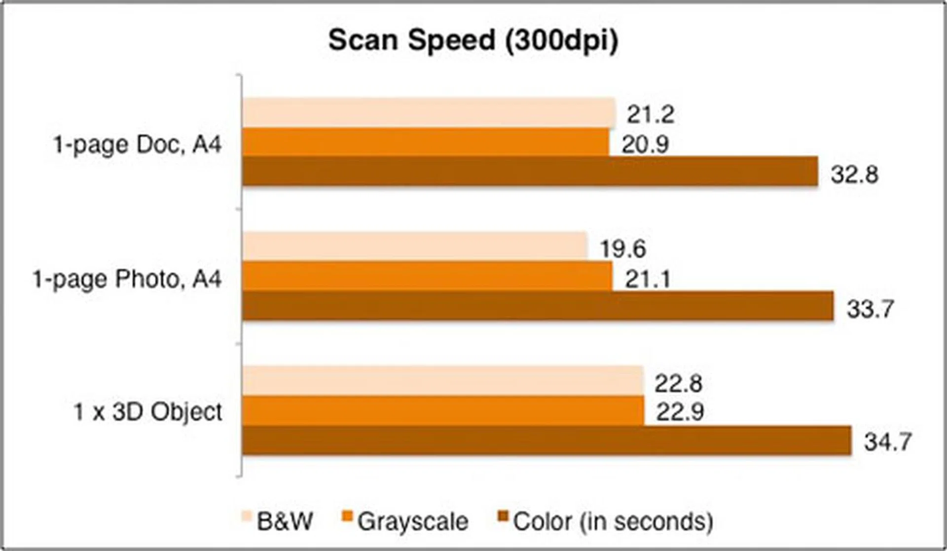 For scanning, we time how long it takes to scan a single-page document from the flatbed scanner to the PC (into either JPEG or PDF format), using the manufacturer's software. In the presence of an ADF, we'd conduct another test using a 10-page document. Various scan resolutions are used, starting from 300 dpi. Timing starts upon job initiation and stops when the files are ready.