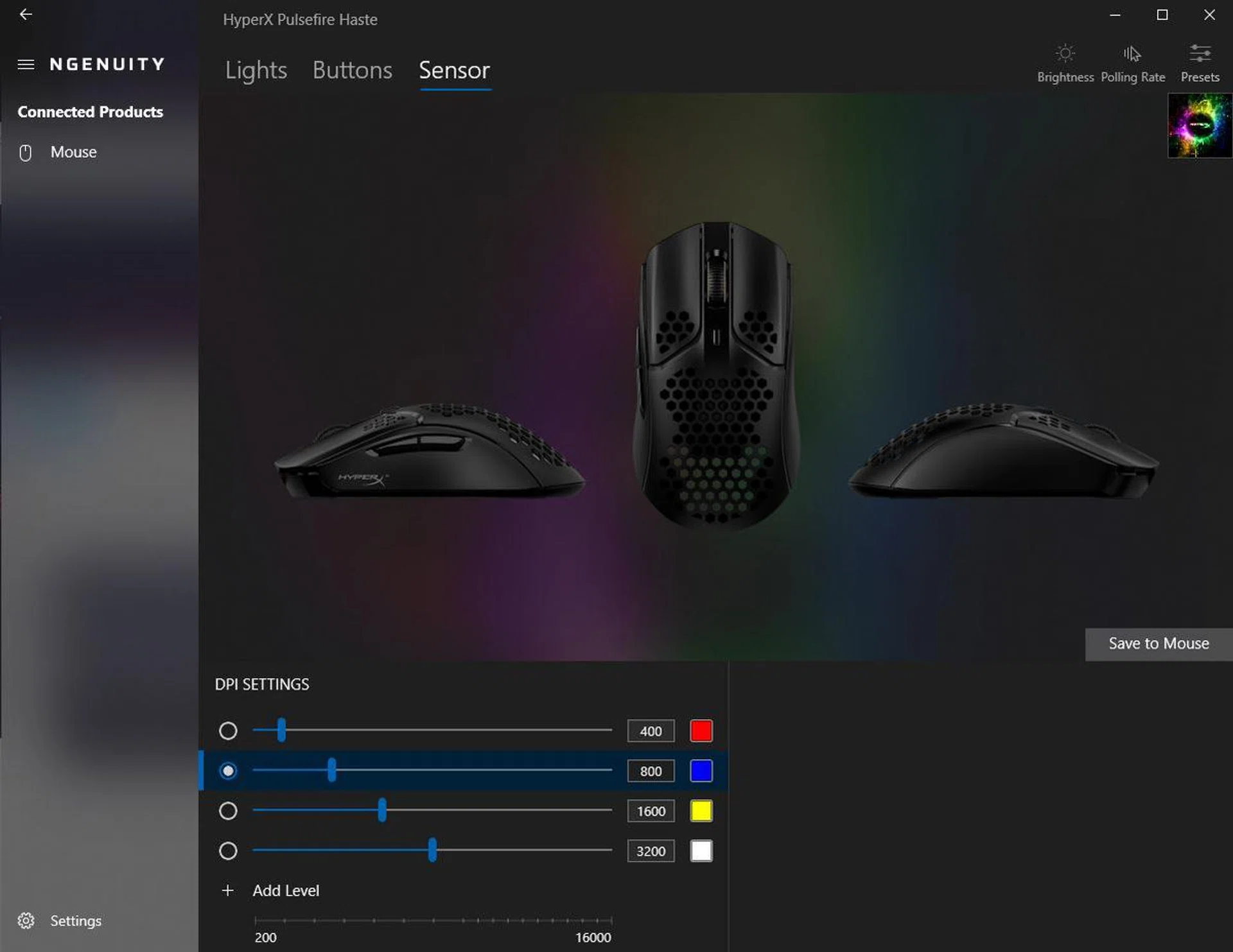 RGB lighting has been kept to a minimum and only the scroll wheel is illuminated. You can customise the lighting in the Ngenuity app, and also choose between Triggered Effects that activate when you press the mouse buttons or effects that persist. However, the available lighting selections are woefully sparse, and there seems to be only a single Fade effect for Triggered Effects and Solid, Cycle and Breathing for Looped Effects. In fact, I feel like HyperX would have been better off ditching RGB lighting altogether rather than offer this uninspiring selection.