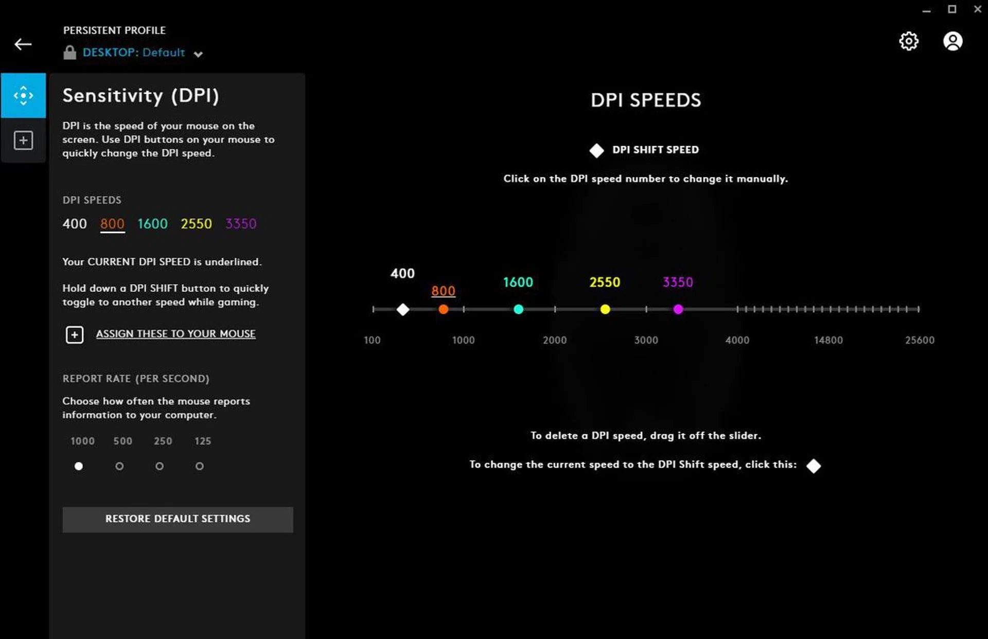 The DPI button sits below the scroll wheel, and you can use it toggle between up to five DPI stages. A colour-coded indicator at the top shows you what sensitivity stage you're on, and it's super easy to customise each stage in the G Hub software. The optical sensor Logitech's 25,000 DPI Hero sensor, and tracking is flawless as expected, with no acceleration or jitter.