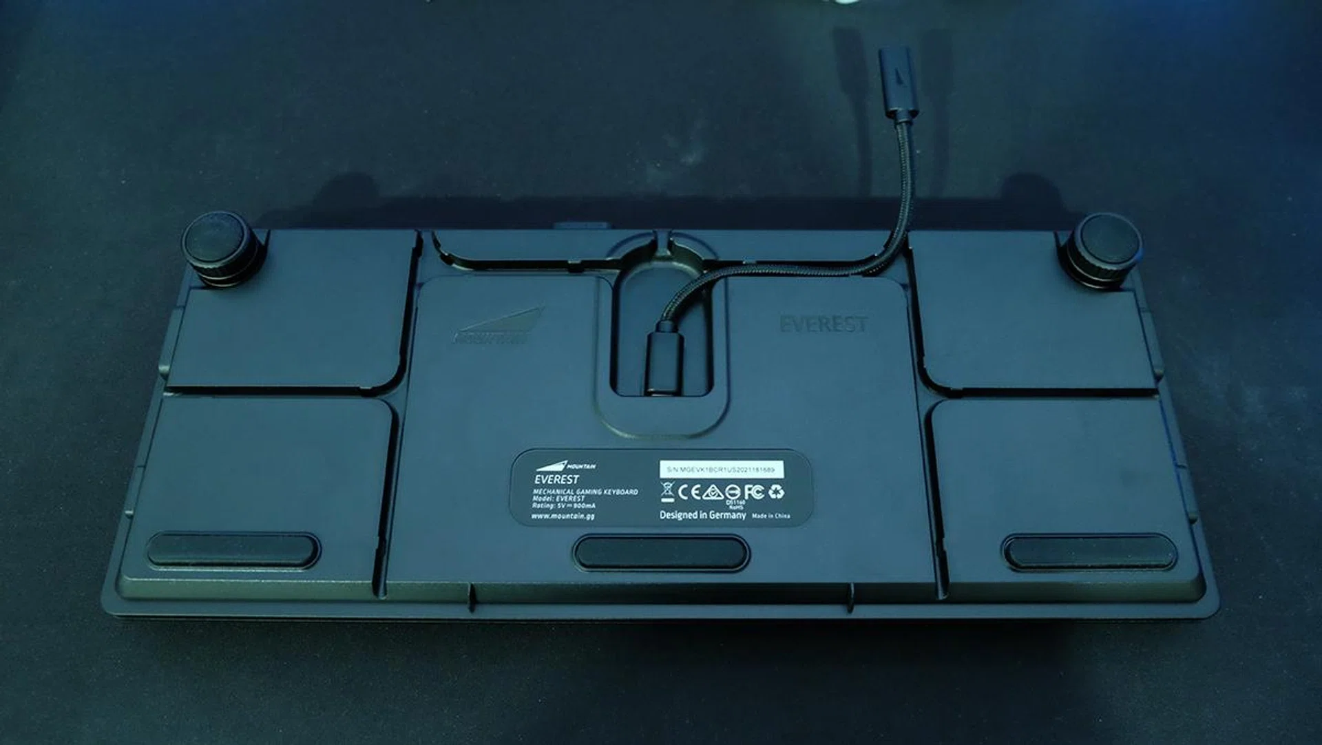 The USB-C port is tucked into its own nook at the bottom of the keyboard, but before you complain that this means you can't use your own custom coiled cables, Mountain has thought of that too. There is a convenient adapter that fits neatly into the cable routing channels, which then allows you to plug in your own USB-C cable. Alternatively, there are also multiple routing channels on the bottom so you can route the stock cable however you want.