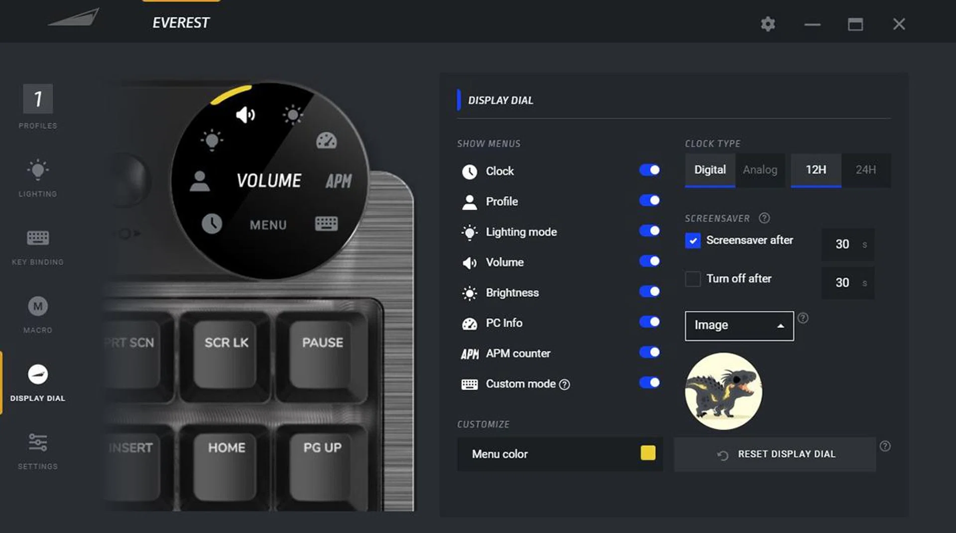 The customisable TFT IPS display dial on the media dock is really neat. You can turn it to cycle between things like a clock, which you can also tweak to your liking, brightness, volume, lighting effects, system information, and even your APM. It's a ton of functionality crammed into a single dial, and there's a nice, tactile feel to every turn. You can even upload a custom .jpg image to display, if you wish.