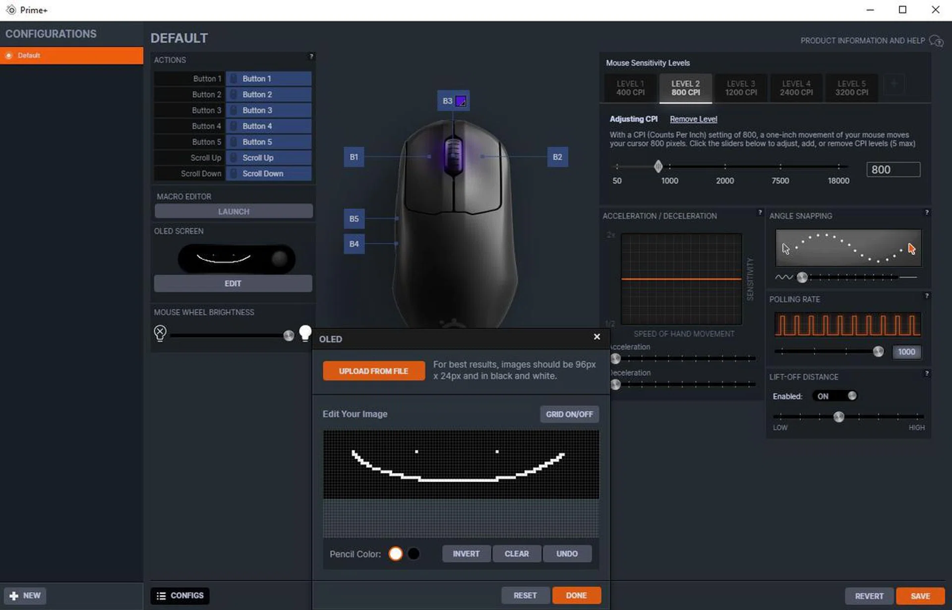 There's a ton of customisations available in the SteelSeries Engine, and you can even draw your own graphic for the OLED display. Here, you'll also find options to control acceleration and deceleration, angle snapping, and the lift-off distance, but most folks probably won't have occasion to touch most of these settings.