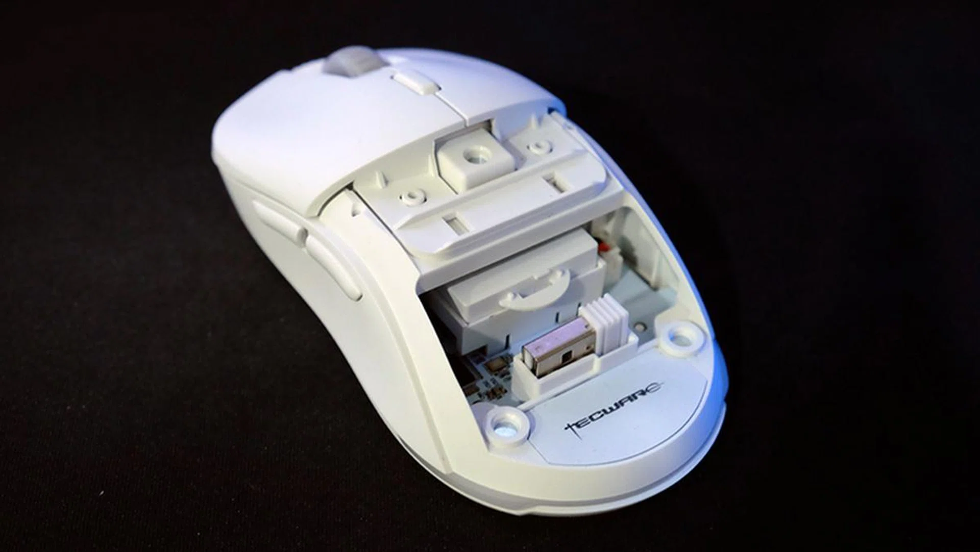 And as it turns out, it's similar to the Gemini One in more ways than one. They both share an uncanny resemblance to the Logitech G Pro Wireless, from the unique curvatures of their shape to the modular side buttons. Interestingly enough, both the SuperSolid and Tecware mice also share the same modular shell and internals, which makes me think they came out of the same factory. In the case of the Pulse, the internal compartment houses the 400mAh battery instead of the customisable weight system. There's also a separate niche where you can store the 2.4GHz dongle.