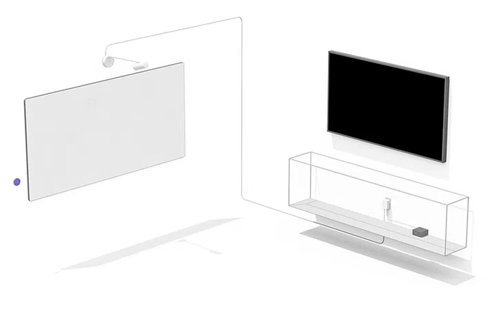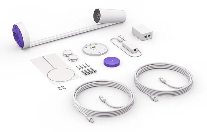 Logitech Scribe uses a wall-mounted design, and it includes a wireless share button, mounting components, power supply unit, and category cables for easy deployment.