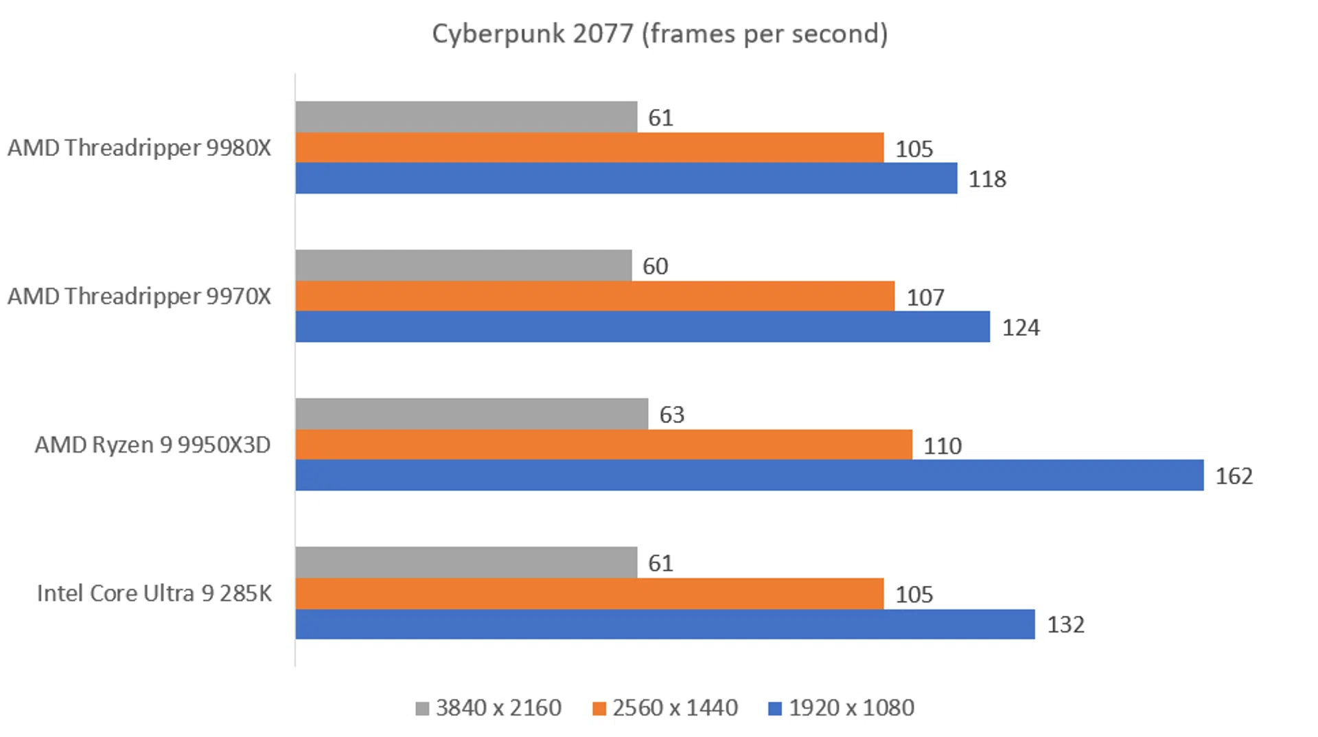 For gaming, I threw Cyberpunk 2077 at all four CPUs. At 1080p, the Ryzen 9 9950X3D flexes its 3D V-Cache muscle with a massive 162fps average. The Threadripper 9970X and 9980X sit lower at 124 and 118fps respectively, while the Core Ultra 9 285K manages 132fps. Once you step up to 1440p and 4K, though, the results flatten out across the board because at higher resolutions, it’s the GPU doing all the heavy graphics lifting – not the processor.