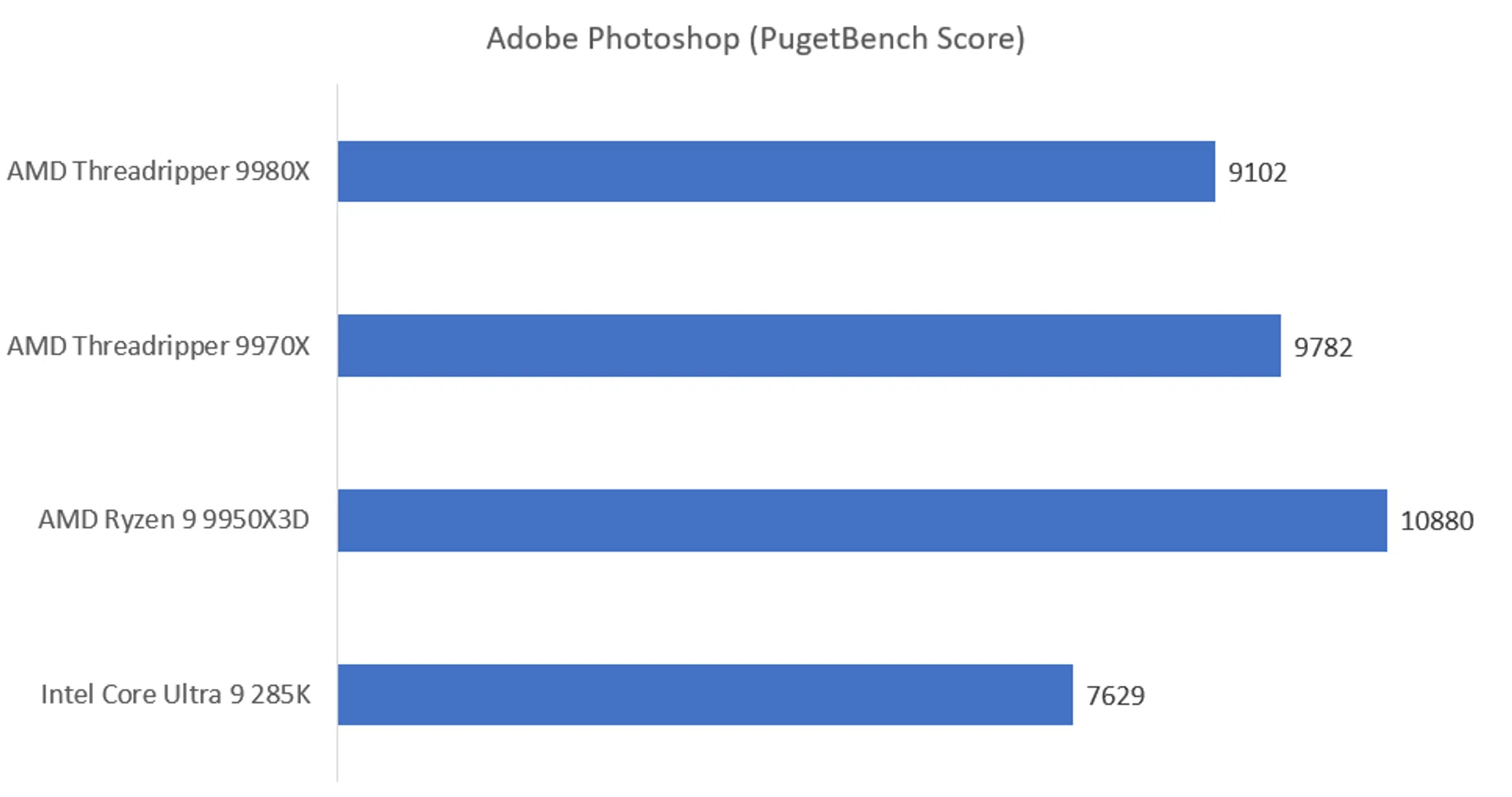 Photoshop, though, tells a more nuanced story. The Ryzen 9 9950X3D actually takes the lead here with a PugetBench score of 10,880, ahead of both Threadrippers (9,782 on the 9970X and 9,102 on the 9980X). Intel’s 285K lags further behind at 7,629. Creative workloads don’t always benefit from brute-force parallelism; in fact, cache and clock speeds play a bigger role here, which is why AMD’s consumer chip edges ahead.