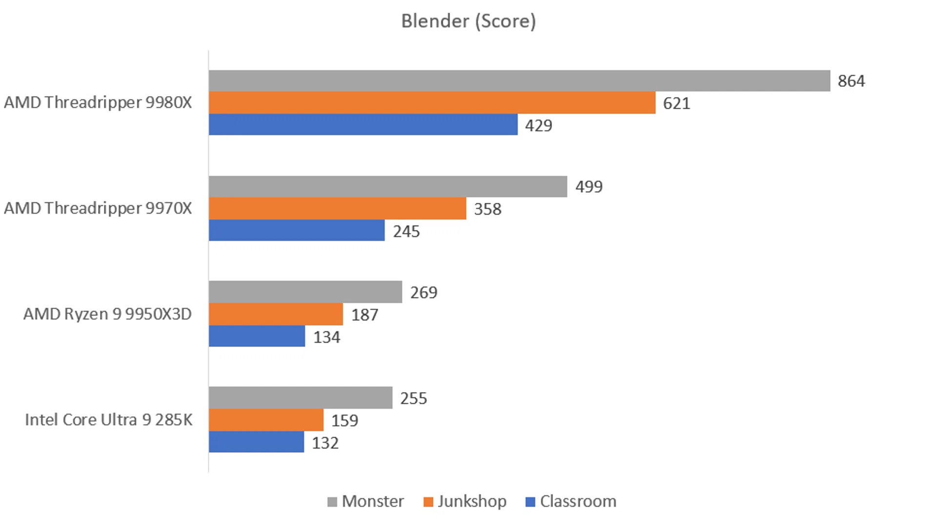 Blender reinforces the same point. The 9980X churns through renders with ease, hitting 864 in the Monster test, 621 in Junkshop, and 429 in Classroom. The 9970X holds its own with 499, 358, and 245 respectively. By comparison, the Ryzen 9 9950X3D and Core Ultra 9 285K are left trailing closer to the 250 mark on Monster, and well below 200 on Junkshop. This is the kind of scaling that matters for people who actually need Threadrippers.