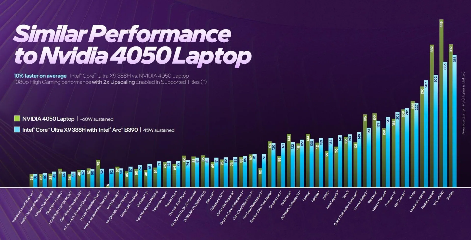 What can you expect? Intel’s tests indicate you can expect the same performance from a laptop equipped with a GeForce RTX 4050 GPU. What’s more interesting is that the power draw of such a laptop is measured around 60W, but Panther Lake’s top CPU – the Core Ultra X9 388H with Intel Arc B390 integrated graphics, can deliver similar performance at just 45W sustained platform power draw. Impressive stats that we would love to also test out with retail-ready laptops shipping in the coming month.