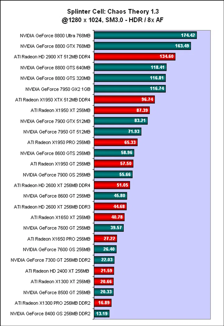 The difference between the slowest and fastest graphics cards could not be more stark here, with the bottom Radeon X1300 PRO producing less than a tenth of the frame rates achieved by the GeForce 8800 Ultra. This was one game where buying the best made an enormous difference. Of course, the price difference between the two is probably also sufficient to buy a PlayStation 3 or Xbox 360. ATI's fastest graphics card, the Radeon HD 2900 XT continued to exist in its own niche between the GeForce 8800 GTX and the GTS and this 'indirect' competition is reflected for most of the other scores; you'll find ATI and NVIDIA cards generally alternating in position as you move down the chart. Whether that is intentional or not, it means that there is likely a specific graphics card suited for a specific price range, though this naturally varies from one game to another.