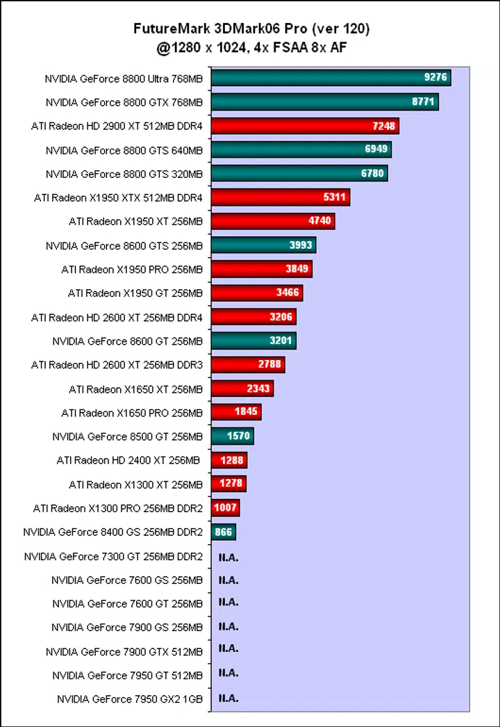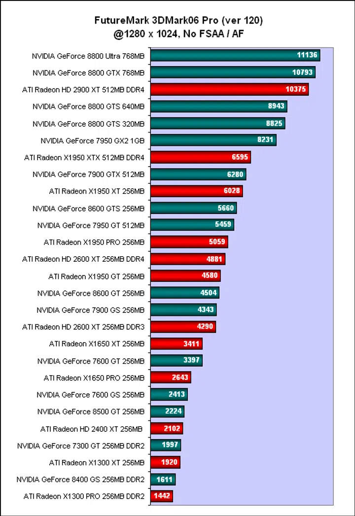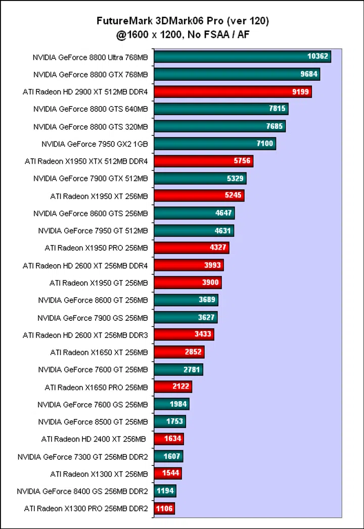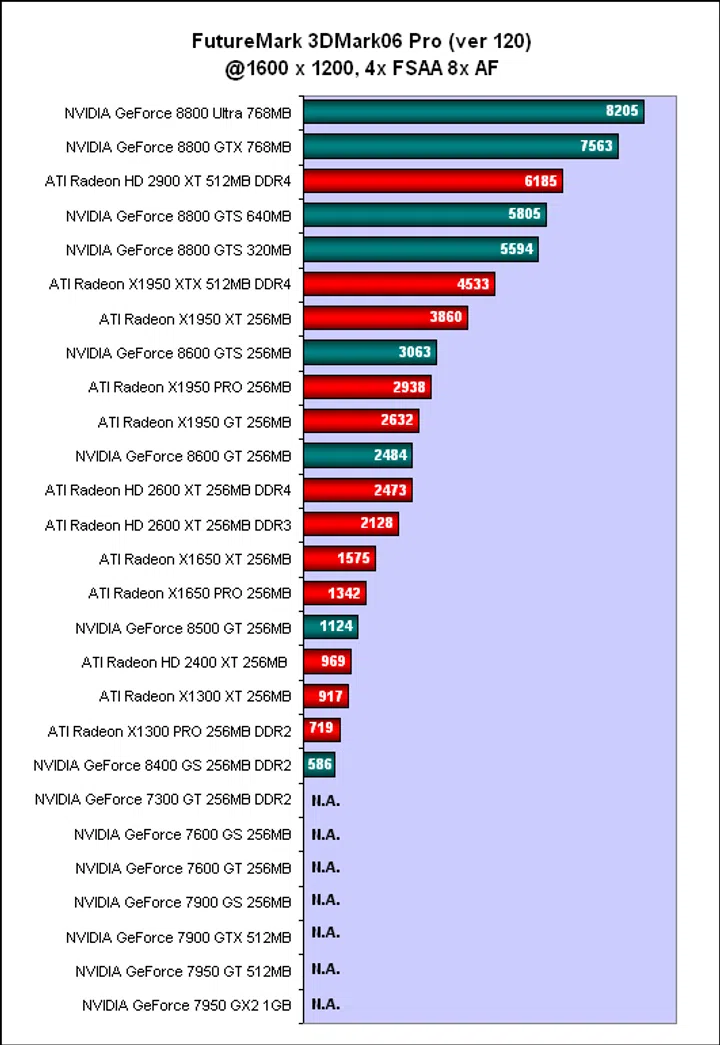 NVIDIA's expensive GeForce 8800 Ultra led the way with a 3 to 7% advantage over the GeForce 8800 GTX in 3DMark06. Meanwhile, ATI's best performer, the Radeon HD 2900 XT managed to gatecrash the GeForce 8800 party, squeezing in ahead of the GeForce 8800 GTS contingent. Looking at the overall performance chart, there are quite a few distinct performance levels, with the GeForce 8800 Ultra, GTX and sometimes the Radeon HD 2900 XT taking the top niche, the GeForce 8800 GTS in a category of its own and then the older high-end GeForce 7 and Radeon X1950 cards jostling in the middle of the table with the newer mid-range GeForce 8 and Radeon HD cards. Of course, the GeForce 7 cards could not complete 3DMark06 with anti-aliasing and high-dynamic-range (HDR) enabled while the bottom was expectedly inhabited by the older GeForce 7 / Radeon X1000 series cards or 64-bit budget cards like the GeForce 8400 GS.