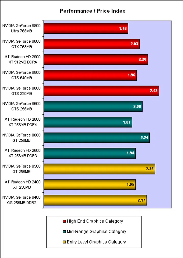So which card is the best value for money? This is shown by the performance / price index below. As you can tell, initially it may seem wrong as some of the entry level cards scored rather high here. However, it does make sense since although these cards do provide good value, their value is limited to their niche category and they fail utterly in more demanding games and applications. (Not surprisingly, the extremely expensive GeForce 8800 Ultra is not really worth it.) Therefore, we recommend that you look at which card is the best value within its performance category and these segments are color-coded in our chart below.