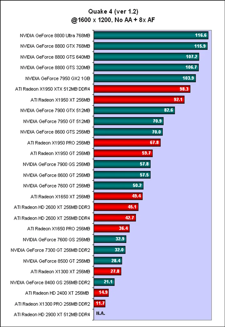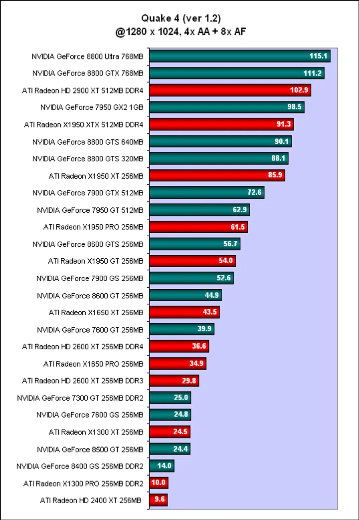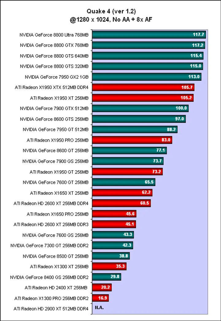 Like in many of our previous benchmarks, Quake 4 showed that the older cards still have what it takes to compete against the new generation. As prices plunge to the lowest for these cards, they can be very attractive, short-term solutions. The mid-range GeForce 8 and Radeon HD cards in particular, have not been very convincing and in Quake 4, we saw the Radeon HD 2600 XT losing out to the NVIDIA GeForce 7600 GT while the NVIDIA GeForce 8500 GT fared even worse. We also saw the GeForce 7950 GT and Radeon X1950 PRO outperforming the GeForce 8600 GTS. Meanwhile, some of the entry level cards were not much better than integrated graphics, registering single digit frame rates in Quake 4, which itself is not that demanding by current standards. Although these new cards do have the advantage of DirectX 10 support and dedicated video processors, going by these scores, we aren't sure if these are real advantages or only good on paper. That will of course be a story for another day, but in this article, it's all about raw gaming performance of existing games.