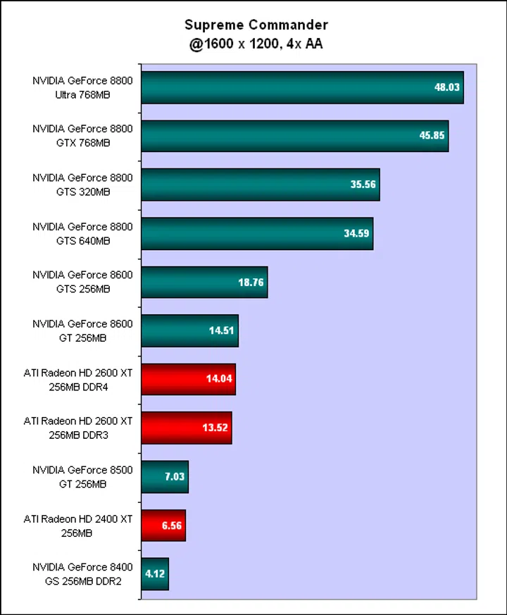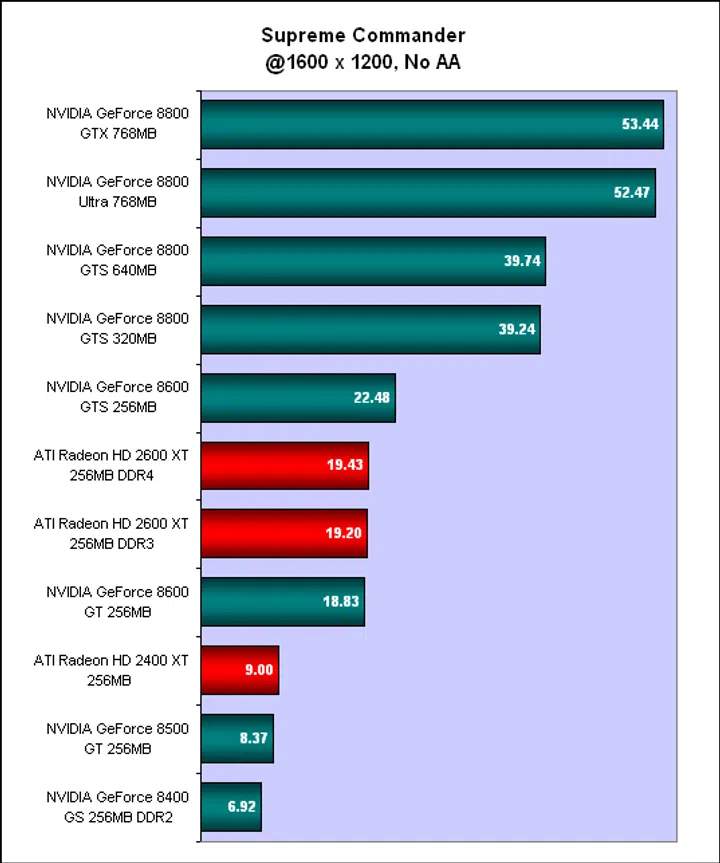 A recent massive real time strategy game, Supreme Commander is on a different scale from the usual RTS game. This epic scale means that in many instances, there are many units on the map and hence, this game seriously taxes both the CPU and GPU, the former due to the AI requirements and the latter, the rendering necessary for such a large battlefield. Unsurprisingly, with the settings put to maximum, even the high-end cards found Supreme Commander rather challenging. We only tested the new cards for this benchmark, but from what we have seen, only the higher mid-range cards (GeForce 8600 GTS and faster) are able to handle this game adequately at our settings. The good news is that there was only a slight performance penalty for enabling anti-aliasing.