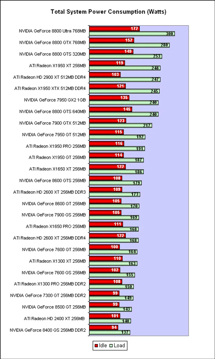As you can see, NVIDIA's high-end GeForce 8800 cards recorded the highest total power draw at full load and at idle, so for the energy conscious bunch, the GeForce 8800 cards may not be the ideal match. ATI's Radeon HD 2900 XT comes close at full load, though still around 50W less than the GeForce 8800 Ultra. At idle, it had commendably low power consumption at only 103W, placing it lower than the GeForce 8600 GTS for one. The high numbers for full load are the reason why power supplies are coming in ever more powerful wattages, not to mention that a multi-GPU SLI or CrossFire configuration will surely inflate these numbers.