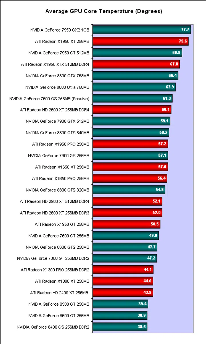 The warmest GPUs of the bunch we tested turned out to be the older cards, namely the 2-in-1 GeForce 7950 GX2 and the Radeon X1950 XTX. Both registered temperatures of more than 70 degrees Celsius for their core temperature in our air-conditioned lab. Fortunately the newer GeForce 8800 GTX topped out at around 66 degrees while the faster Ultra did even better by shaving off a couple of degrees. ATI's top Radeon HD card also performed well here with its two-slot cooler and had the edge over both the GeForce 8800 GTX and GTS. Overall, most of the graphics cards fell in between the 40 - 60 degrees range and with decent case ventilation, most users should find the default cooling sufficient.