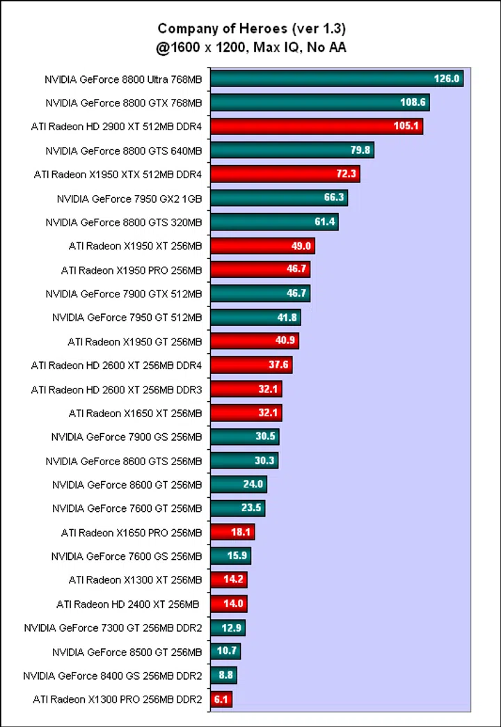 Similar to F.E.A.R, there was a rather giant gap between the really high-end cards and the merely high-end. A reasonably powerful GeForce 8800 GTS was around 20 to more than 30 frames slower than the GeForce 8800 GTX. The other slower cards were mostly clustered together, with the ATI cards generally performing slightly better than its NVIDIA counterpart. The mid-range GeForce 7600 GT for example was equal to the newer GeForce 8600 GT here and both performed decently with more than 30 frames per second. There is a Company of Heroes patch available for DirectX 10 compatibility, though we recommend this only for the high-end graphics card, and not the GeForce 8500 GT class.