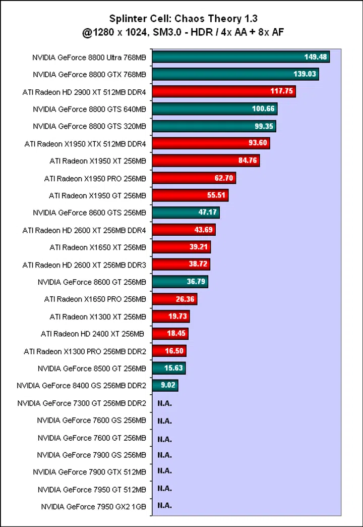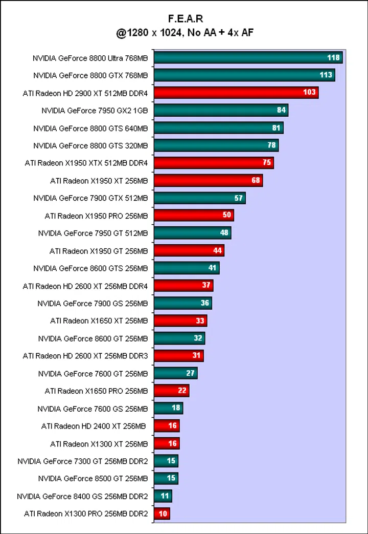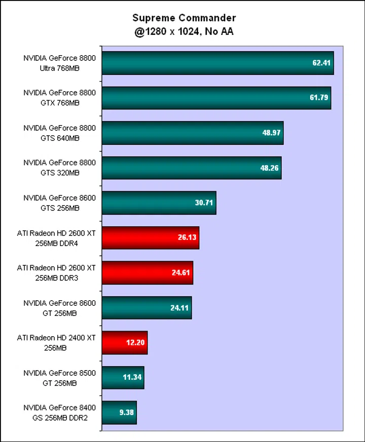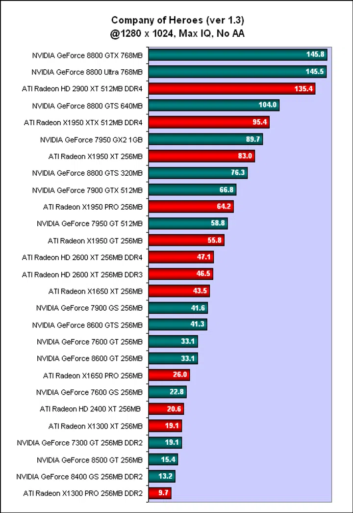 Hence, this comparison table will not include the GeForce 7 or the Radeon X1000 series. Next, we had to choose from the benchmarks which ones to use for our ranking. In this case, we were forced by circumstances to eliminate some benchmarks; for example, we could not use Supreme Commander as we lacked scores for the Radeon HD 2900 XT for it. And finally, we had to select resolutions and settings for the scores and we chose 1280 x 1024 since that resolution is not beyond the low end cards and we also included scores with and without anti-aliasing enabled.